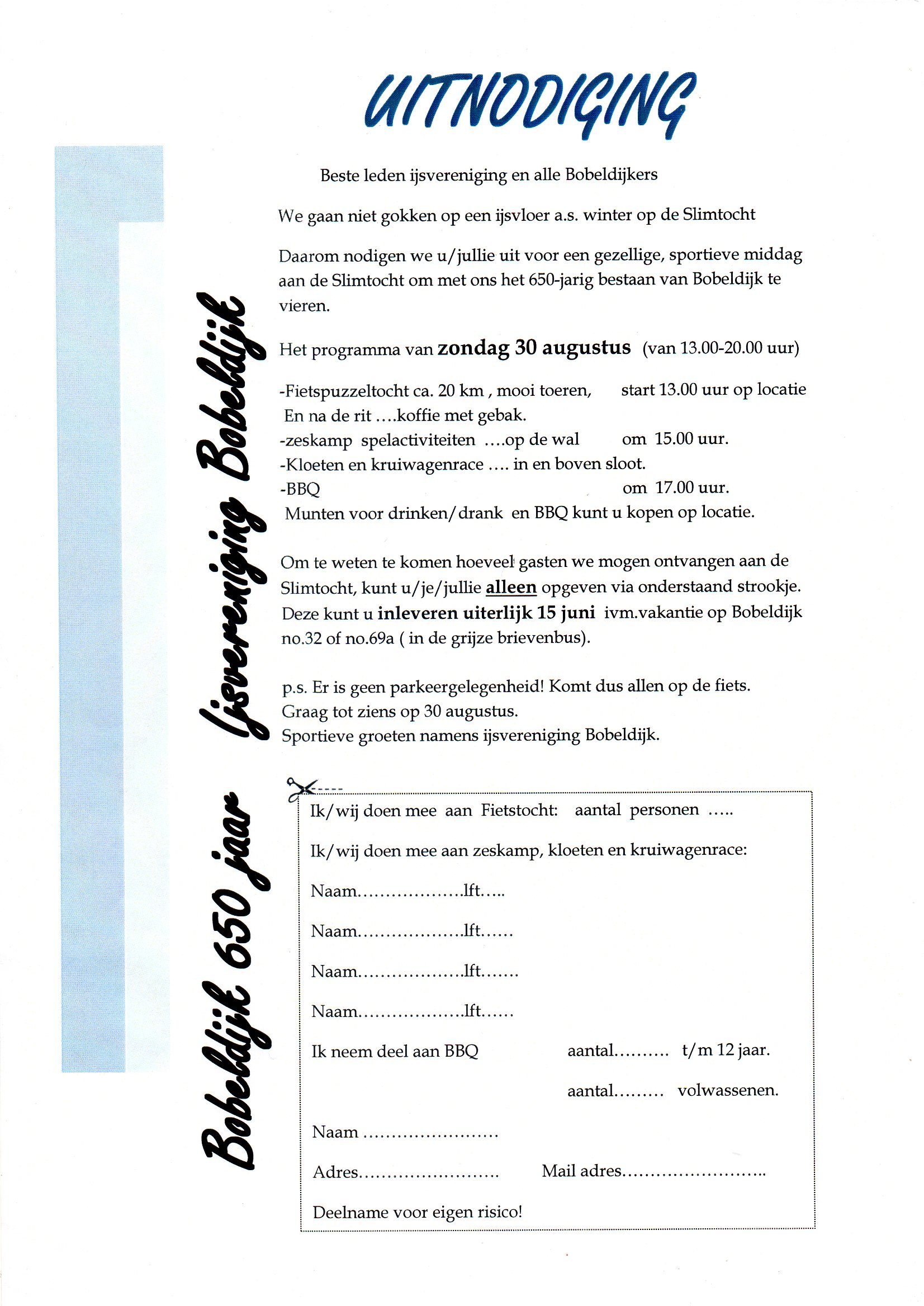 Onze IJsvereniging Bobeldijk is ook bij deze zomerse temperaturen heel actief. De voorbereidingen voor 30 augustus zijn in volle gang en het belooft weer een mooie dag te worden. Weet u het nog: een fietspuzzeltocht, zeskamp spel, kloeten en kruiwagenrace, barbecue. En dat alles op/naast de historische Slimtocht.