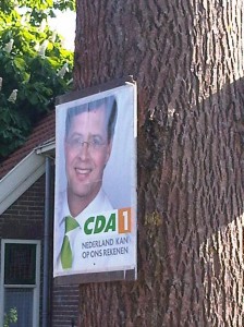 Een lachende, maar tegelijk enigszins bezorgd ogende Jan Peter Balkenende kijkt mij aan vanaf het bord. “Nederland kan op ons rekenen” luidt het onderschrift. Ik ben meteen wakker. Verwonderd vraag ik me af waarom juist hier deze oproep hangt. Daar zijn toch speciale plakplaatsen voor? Plaatsen waar onze landelijke politieke kopstukken gezamenlijk over elkaar heen buitelen en soms tot vér na verkiezingstijd langdurig blijven plakken? Diverse gedachten passeren al fietsend de revue.