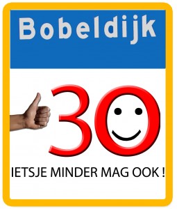 Naast de mysterieuze vlaggetjes van een tijdje geleden zijn op de Bobeldijk sinds kort ook flyers opgehangen om automobilisten op positieve wijze (“thumbs up”) te herinneren aan de maximale snelheid. Een persoonlijk initiatief van één van onze bewoners.